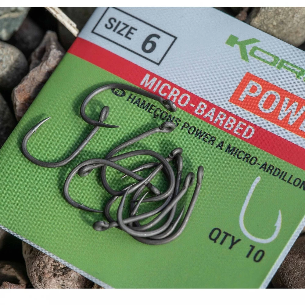 Korum Xpert Power Micro Barbed Hook Size 6, chemisch geslepen haken met oog een perfecte anti schittering afwerking combineert fantastisch. Ultra betrouwbare sterk zijn perfect voor de Karper en Brasem visserij. Zeer sterke haak dankzij het dikke draad en korte steel 12 graden omlaag gedraaid oog waardoor de haak automatisch in de bek van de vis draait Anti schittering, Eyed and Barbed. Wijde bocht voor maximale haak eigenschappen bij het gebruik van haarrigs. Perfect te gebruiken voor haarrigs, Chemisch en recht geslepen punt waar door de haak langer scherp blijft. Zeer geschikt voor gevlochten en mono lijnen van Korum.